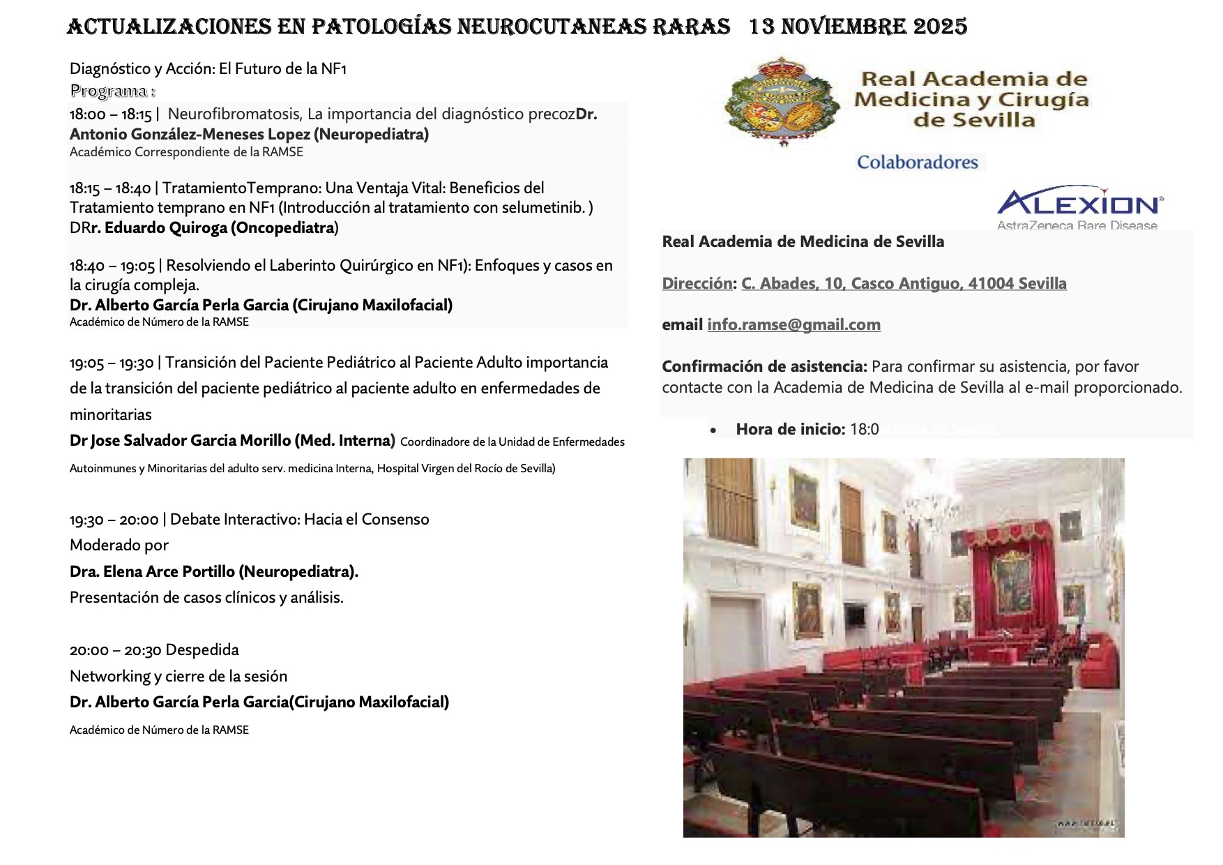 ∙ Confirmación de asistencia: Para confirmar su asistencia, por favor contacte con la Academia de Medicina de Sevilla al e-mail: info.ramse@gmail.com