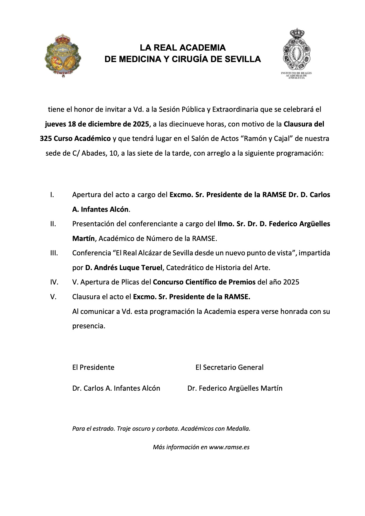 Sesión Pública y Extraordinaria que se celebrará el jueves 18 de diciembre de 2025, a las diecinueve horas, con motivo de la Clausura del 325 Curso Académico y que tendrá lugar en el Salón de Actos “Ramón y Cajal” de nuestra sede de C/ Abades, 10, a las siete de la tarde, con arreglo a la siguiente programación: