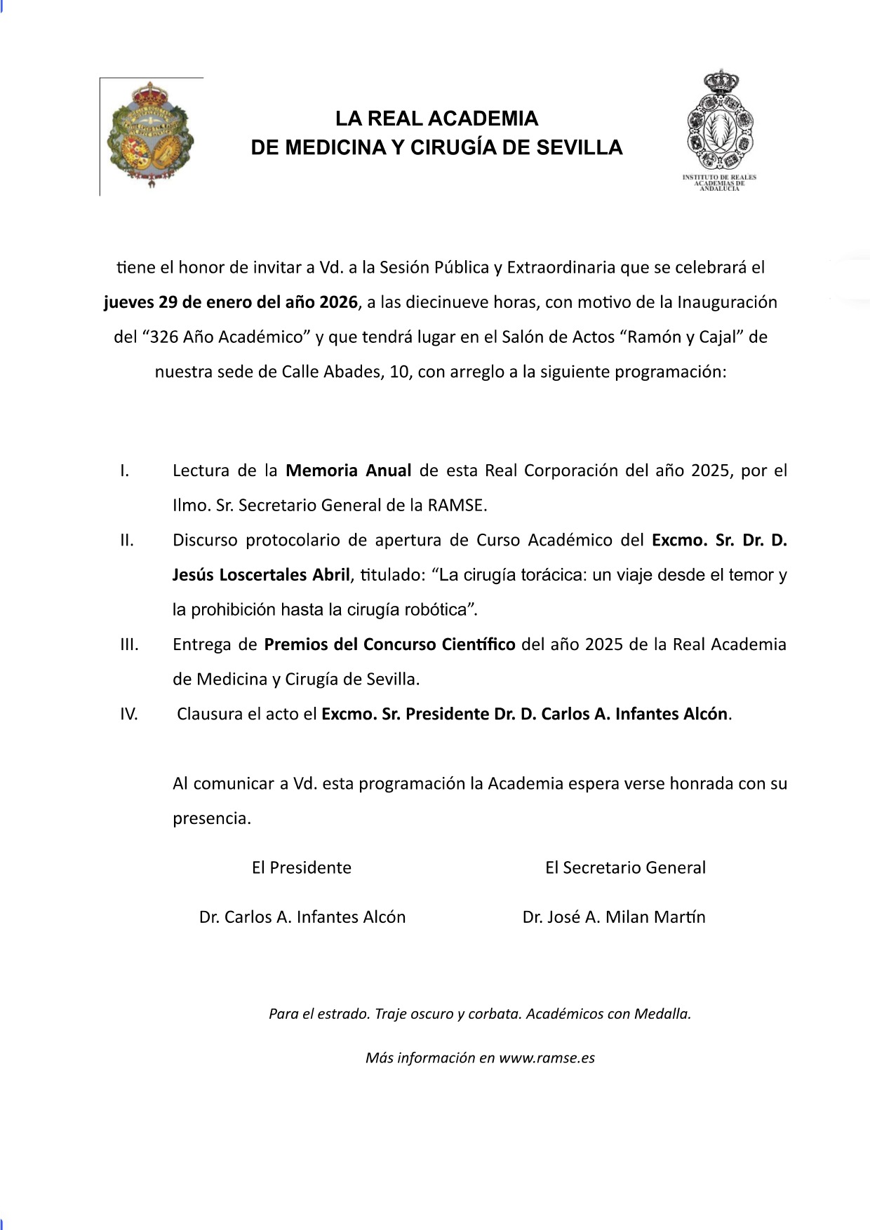 tiene el honor de invitar a Vd. a la Sesión Pública y Extraordinaria que se celebrará el jueves 29 de enero del año 2026, a las diecinueve horas, con motivo de la Inauguración del “326 Año Académico” y que tendrá lugar en el Salón de Actos “Ramón y Cajal” de nuestra sede de Calle Abades, 10, con arreglo a la siguiente programación: