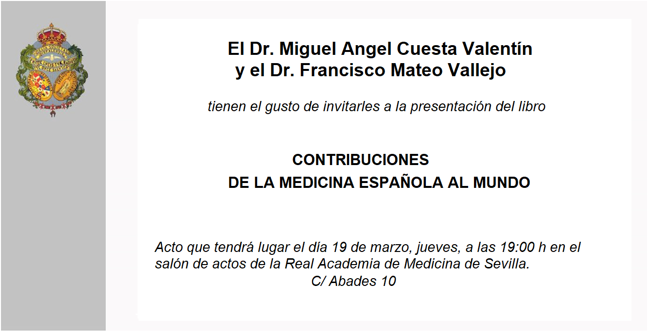 Acto que tendrá lugar el día 19 de marzo, jueves, a las 19:00 h en el salón de actos de la Real Academia de Medicina de Sevilla.
