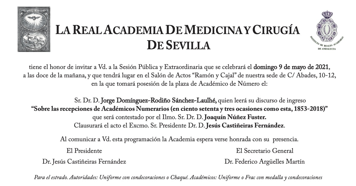 La Real Academia de Medicina y Cirugía de Sevilla celebra Sesión Pública y Extraordinaria que tendrá lugar el domingo 9 de mayo de 2021, a las doce de la mañana en el Salón de Actos “Ramón y Cajal” de su sede de C/ Abades, 10-12, en la que tomará posesión de la plaza de Académico de Número el: Sr. Dr. D. Jorge Domínguez-Rodiño Sánchez-Laulhé, quien leerá su discurso de ingreso “Sobre las recepciones de Académicos Numerarios (en ciento setenta y tres ocasiones como esta, 1853-2018)”, que será contestado por el Ilmo. Sr. Dr. D. Joaquín Núñez Fuster.