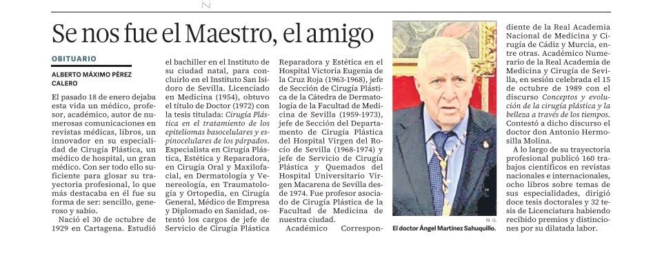 Obituario publicado en Diario de Sevilla, de nuestro académico D. Ángel Martínez Sahuquillo, escrito por el académico D. Alberto Máximo Pérez Calero. Puede descargar el artículo en este enlace.