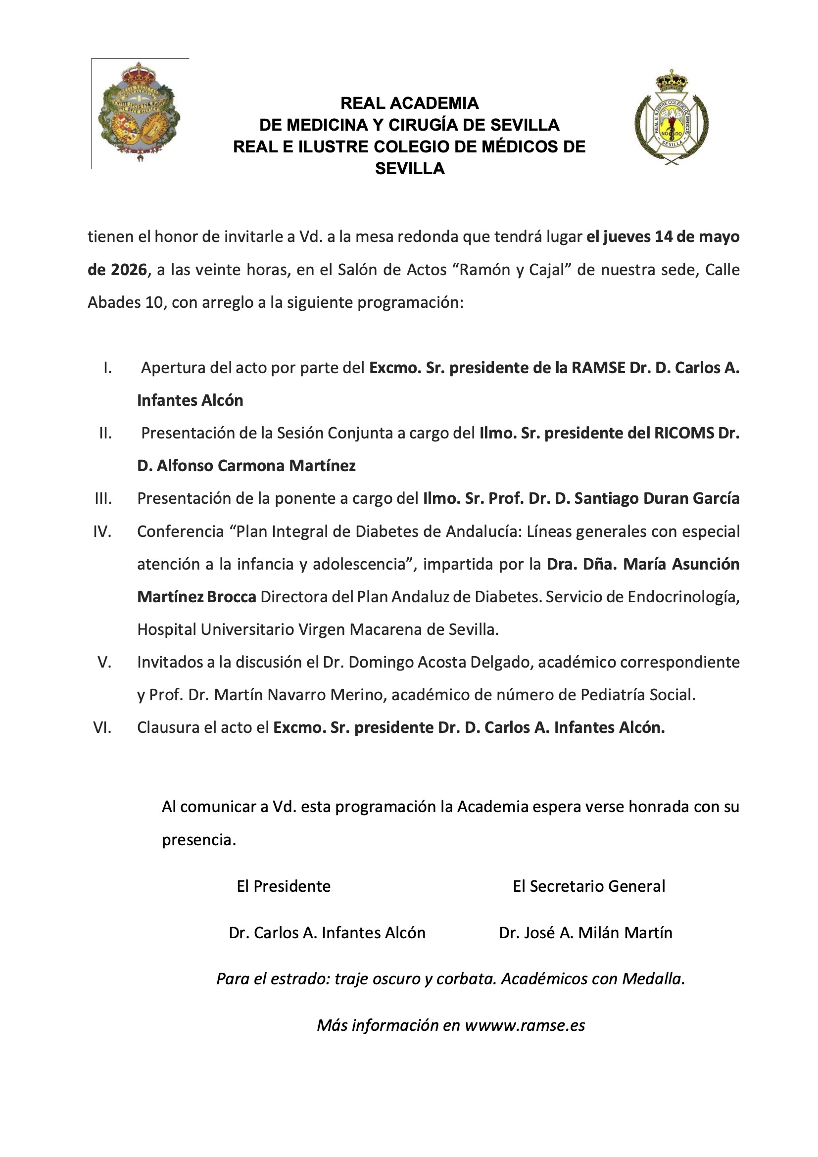 María2026-04-28T12:05:01+02:00REAL ACADEMIA DE MEDICINA Y CIRUGÍA DE SEVILLA REAL E ILUSTRE COLEGIO DE MÉDICOS DE SEVILLA tienen el honor de invitarle a Vd. a la mesa redonda que tendrá lugar el jueves 14 de mayo de 2026, a las veinte horas, en el Salón de Actos “Ramón y Cajal” de nuestra sede, Calle Abades 10, con arreglo a la siguiente programación: I. Apertura del acto por parte del Excmo. Sr. presidente de la RAMSE Dr. D. Carlos A. Infantes Alcón II. Presentación de la Sesión Conjunta a cargo del Ilmo. Sr. presidente del RICOMS Dr. D. Alfonso Carmona Martínez III. Presentación [...]